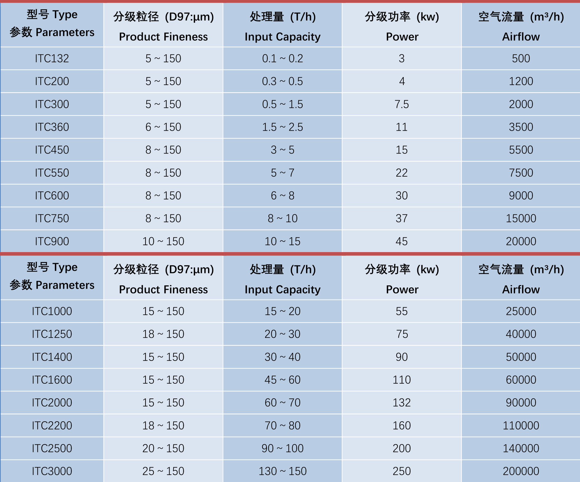 注:1.设备的(de)处理量与物料的性质及产品(pǐn)粒度要求有关(guān)。   2.产(chǎn)品粒度可调。